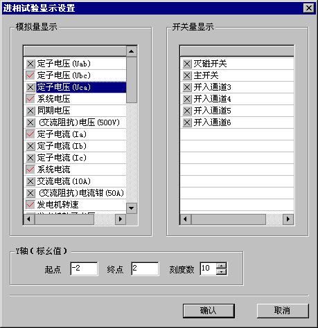 A. 进入程序画面后首先进行显示设置,从全部记录的参量中选择本次试验需在曲线显示窗口显示的的模拟量和开关量,并且设定合适的Y轴的标么值的起始点及刻度数;此项功能也可在试验进行中完成、更改。